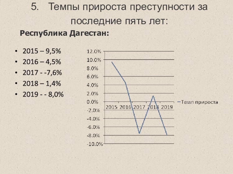 5.	Темпы прироста преступности за последние пять лет: Республика Дагестан:2015 – 9,5%2016 – 4,5%2017 - -7,6%2018 – 1,4%2019