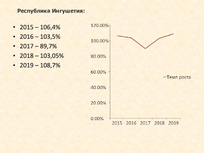 Республика Ингушетия:2015 – 106,4%2016 – 103,5%2017 – 89,7%2018 – 103,05%2019 – 108,7%