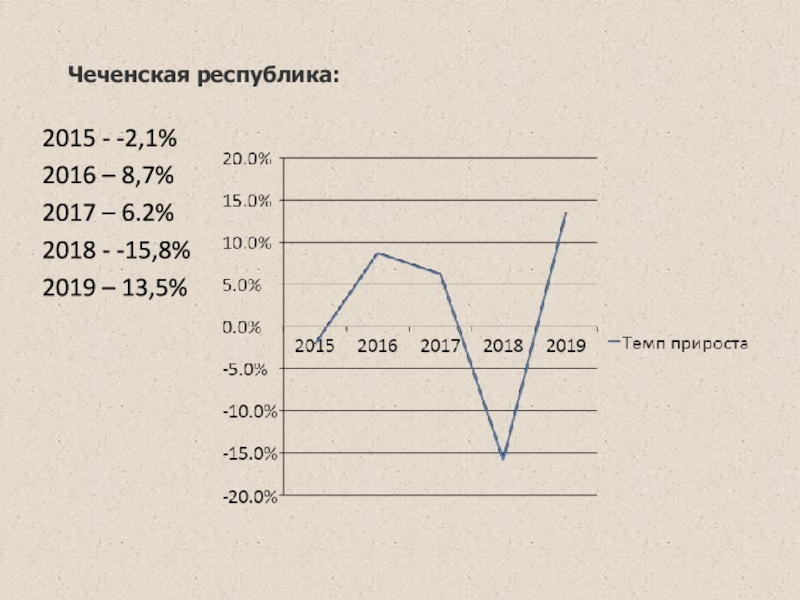 Чеченская республика: 2015 - -2,1%2016 – 8,7%2017 – 6.2%2018 - -15,8%2019 – 13,5%