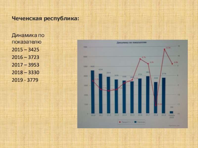 Чеченская республика: Динамика по показателю2015 – 34252016 – 37232017 – 39532018 – 33302019 - 3779