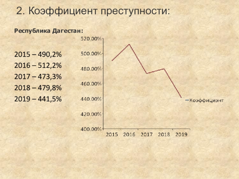 2. Коэффициент преступности:Республика Дагестан: 2015 – 490,2%2016 – 512,2%2017 – 473,3%2018 – 479,8%2019 – 441,5%