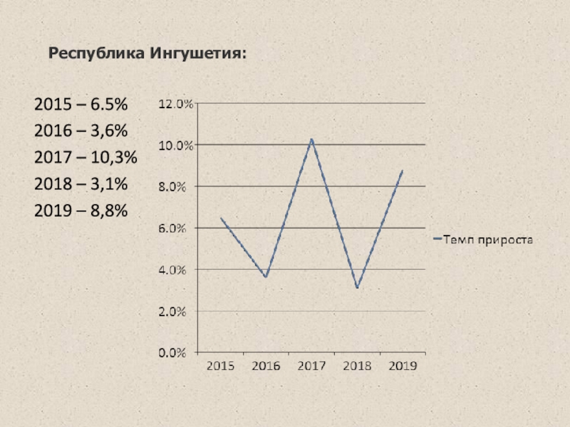 Республика Ингушетия: 2015 – 6.5%2016 – 3,6%2017 – 10,3%2018 – 3,1%2019 – 8,8%