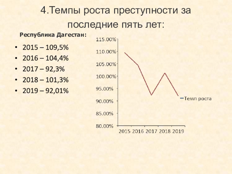 4.Темпы роста преступности за последние пять лет:  Республика Дагестан:2015 – 109,5%2016 – 104,4%2017 – 92,3%2018 –
