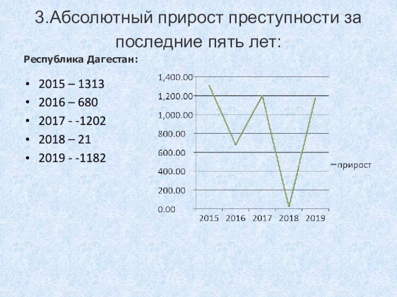 3.Абсолютный прирост преступности за последние пять лет: Республика Дагестан:2015 – 13132016 – 6802017 - -12022018 – 212019