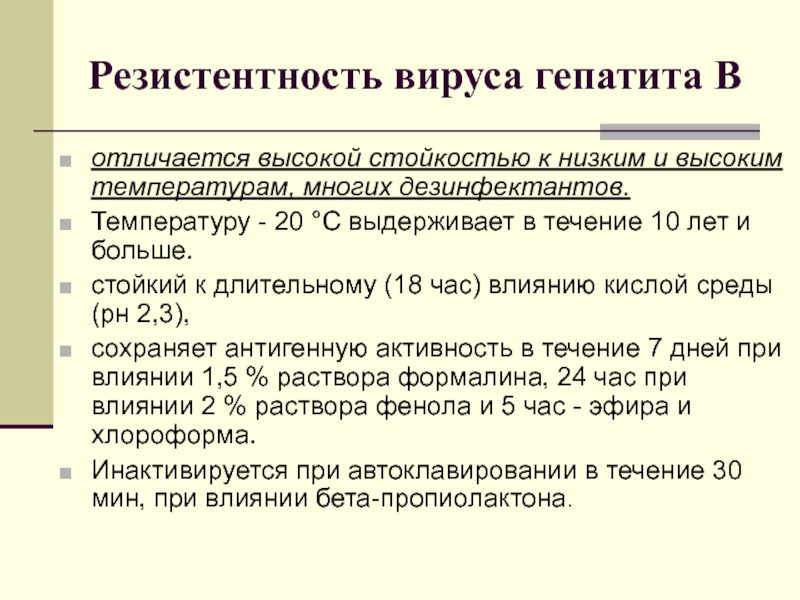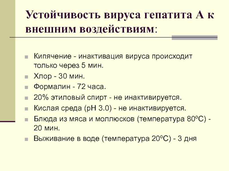 Слайд 10Устойчивость вируса гепатита А к внешним воздействиям:
