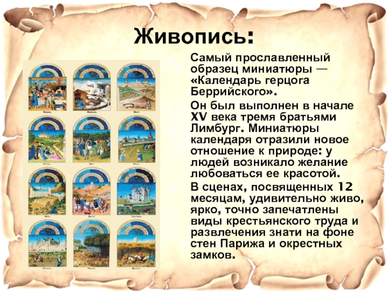 В сценах, посвященных 12 месяцам, удивительно живо, ярко, точно запечатлены виды крестьянского труда и развлечения знати на фоне стен Парижа и окрестных замков.