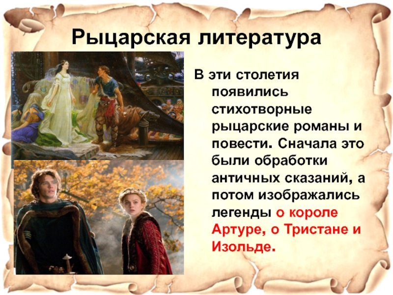 Слайд 6В эти столетия появились стихотворные рыцарские романы и повести. Сначала