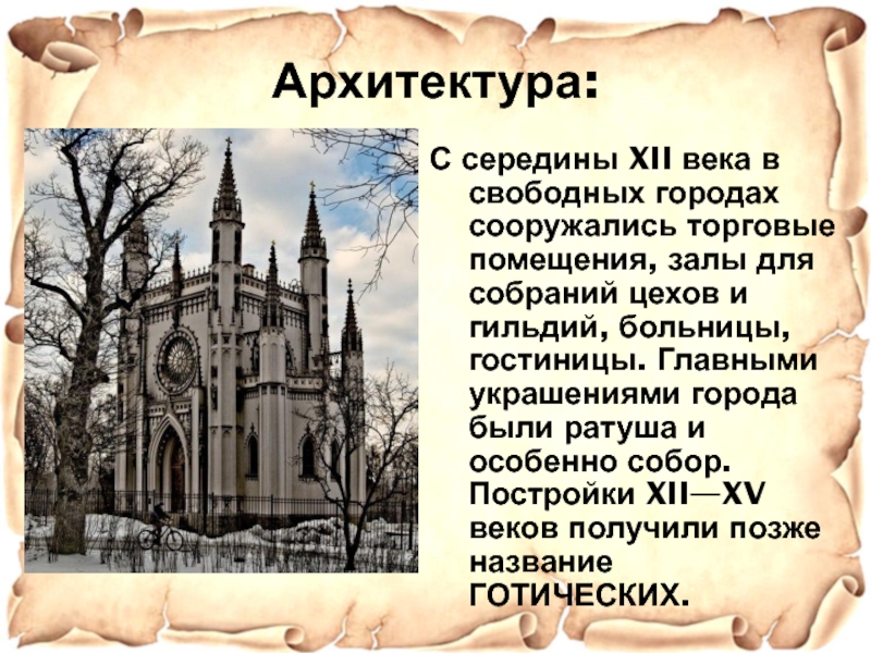 города были ратуша и особенно собор. Постройки XII—XV веков получили позже название ГОТИЧЕСКИХ.