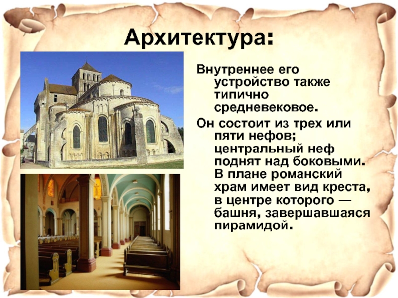 на сводах, оконных проемах, входах в храм. В то же время своей мощью романские храмы напоминают замки.
