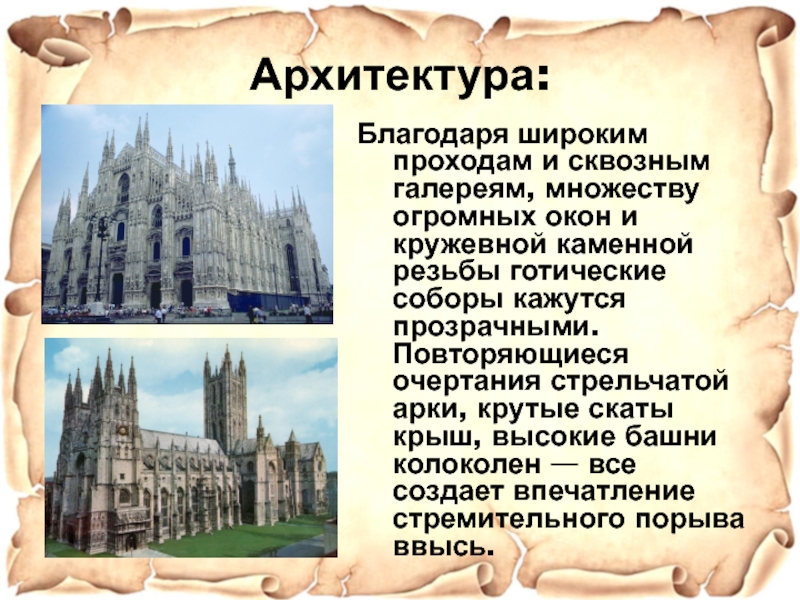 кружевной каменной резьбы готические соборы кажутся прозрачными. Повторяющиеся очертания стрельчатой