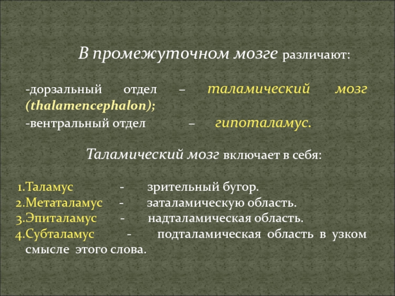 -дорзальный отдел – таламический мозг (thalamencephalon);