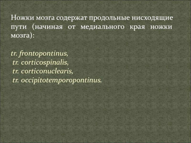 Слайд 17Ножки мозга содержат продольные нисходящие пути (начиная от медиального края