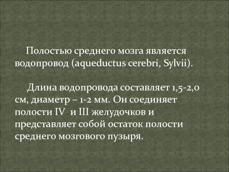 Длина водопровода составляет 1,5-2,0 см, диаметр – 1-2 мм. Он соединяет полости IV и III желудочков и представляет собой остаток полости среднего мозгового пузыря.