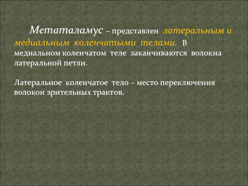 Метаталамус – представлен латеральным и медиальным коленчатыми