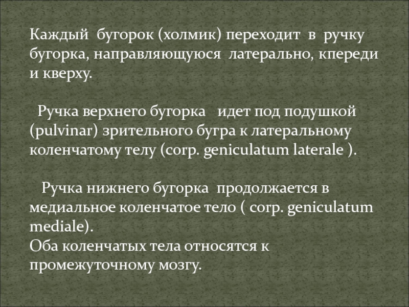Ручка нижнего бугорка продолжается в медиальное коленчатое тело ( corp. geniculatum mediale).