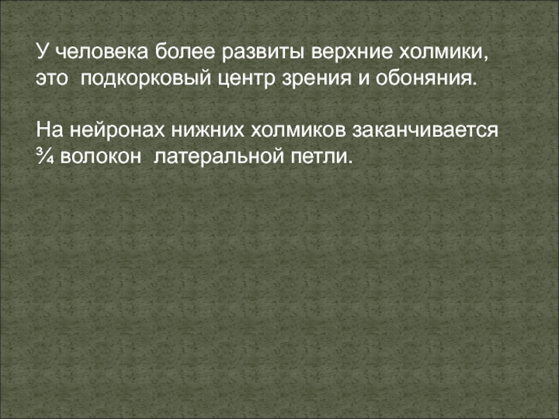 Слайд 13У человека более развиты верхние холмики, это подкорковый центр зрения