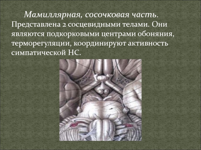 Слайд 35 Мамиллярная, сосочковая часть. Представлена 2 сосцевидными телами.