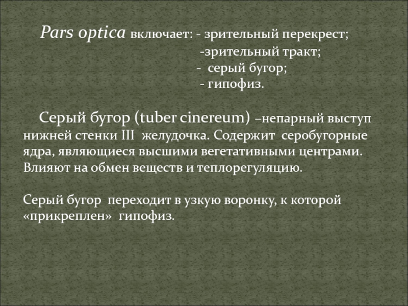 Серый бугор (tuber cinereum) –непарный выступ нижней стенки III желудочка. Содержит серобугорные ядра, являющиеся высшими вегетативными центрами. Влияют на обмен веществ и теплорегуляцию.