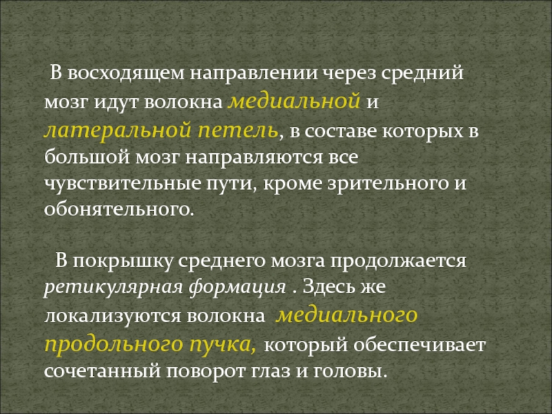 Слайд 14 В восходящем направлении через средний мозг идут волокна медиальной