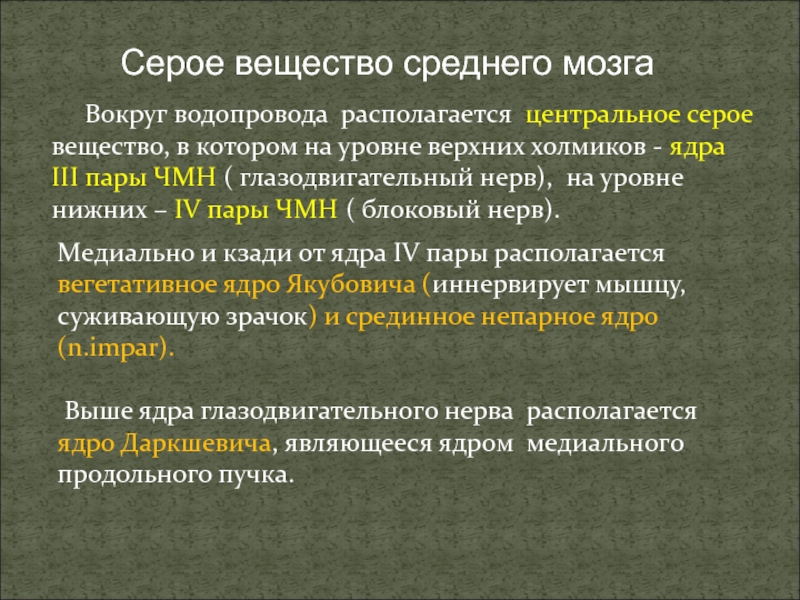 Выше ядра глазодвигательного нерва располагается ядро Даркшевича, являющееся ядром медиального продольного пучка.