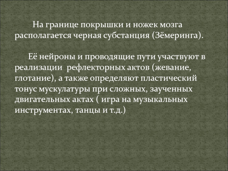 пути участвуют в реализации рефлекторных актов (жевание, глотание), а также определяют пластический тонус мускулатуры при сложных, заученных двигательных актах ( игра на музыкальных инструментах, танцы и т.д.)