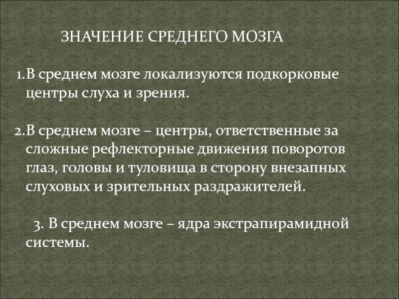 Слайд 19 ЗНАЧЕНИЕ СРЕДНЕГО МОЗГА