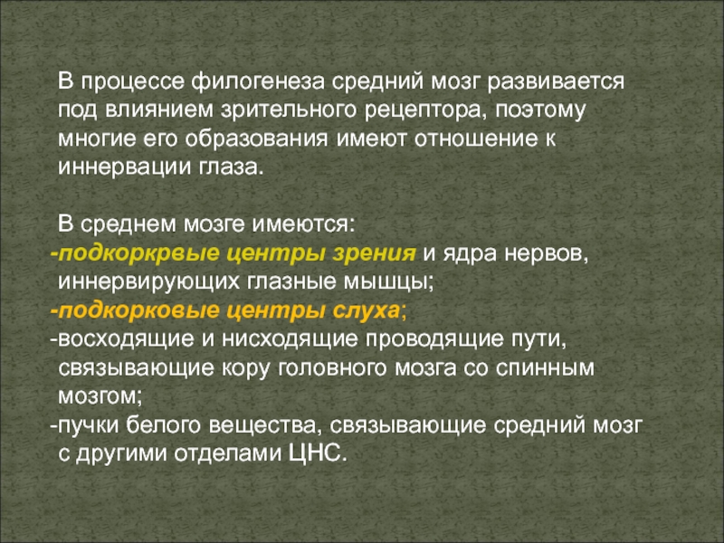 Слайд 18В процессе филогенеза средний мозг развивается под влиянием зрительного рецептора,