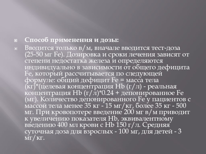 железа и определяются индивидуально в зависимости от общего дефицита Fe, который рассчитывается по следующей формуле: общий дефицит Fe = масса тела (кг)*(целевая концентрация Hb (г/л) - реальная концентрация Hb (г/л)*0.24 + депонированное Fe (мг). Количество депонированного Fe у пациентов с массой тела менее 35 кг - 15 мг/кг, более 35 кг - 500 мг. При кровопотере введение 200 мг в/м приводит к увеличению показателя Hb, эквивалентному введению 400 мл крови с Hb 150 г/л. Средняя суточная доза для взрослых - 100 мг, для детей - 3 мг/кг.