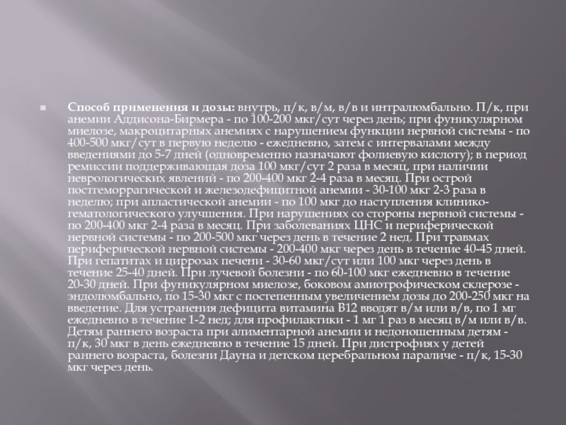 при фуникулярном миелозе, макроцитарных анемиях с нарушением функции нервной системы - по 400-500 мкг/сут в первую неделю - ежедневно, затем с интервалами между введениями до 5-7 дней (одновременно назначают фолиевую кислоту); в период ремиссии поддерживающая доза 100 мкг/сут 2 раза в месяц, при наличии неврологических явлений - по 200-400 мкг 2-4 раза в месяц. При острой постгеморрагической и железодефицитной анемии - 30-100 мкг 2-3 раза в неделю; при апластической анемии - по 100 мкг до наступления клинико-гематологического улучшения. При нарушениях со стороны нервной системы - по 200-400 мкг 2-4 раза в месяц. При заболеваниях ЦНС и периферической нервной системы - по 200-500 мкг через день в течение 2 нед. При травмах периферической нервной системы - 200-400 мкг через день в течение 40-45 дней. При гепатитах и циррозах печени - 30-60 мкг/сут или 100 мкг через день в течение 25-40 дней. При лучевой болезни - по 60-100 мкг ежедневно в течение 20-30 дней. При фуникулярном миелозе, боковом амиотрофическом склерозе - эндолюмбально, по 15-30 мкг с постепенным увеличением дозы до 200-250 мкг на введение. Для устранения дефицита витамина B12 вводят в/м или в/в, по 1 мг ежедневно в течение 1-2 нед; для профилактики - 1 мг 1 раз в месяц в/м или в/в. Детям раннего возраста при алиментарной анемии и недоношенным детям - п/к, 30 мкг в день ежедневно в течение 15 дней. При дистрофиях у детей раннего возраста, болезни Дауна и детском церебральном параличе - п/к, 15-30 мкг через день.