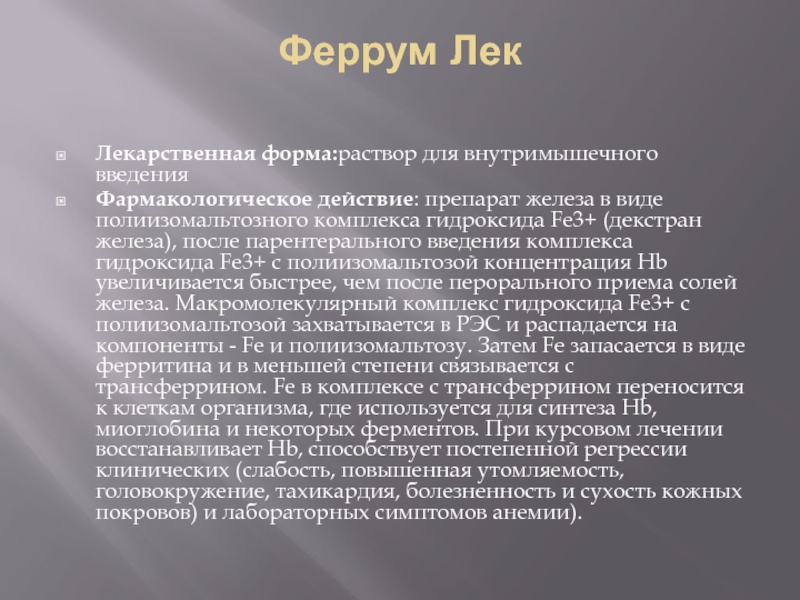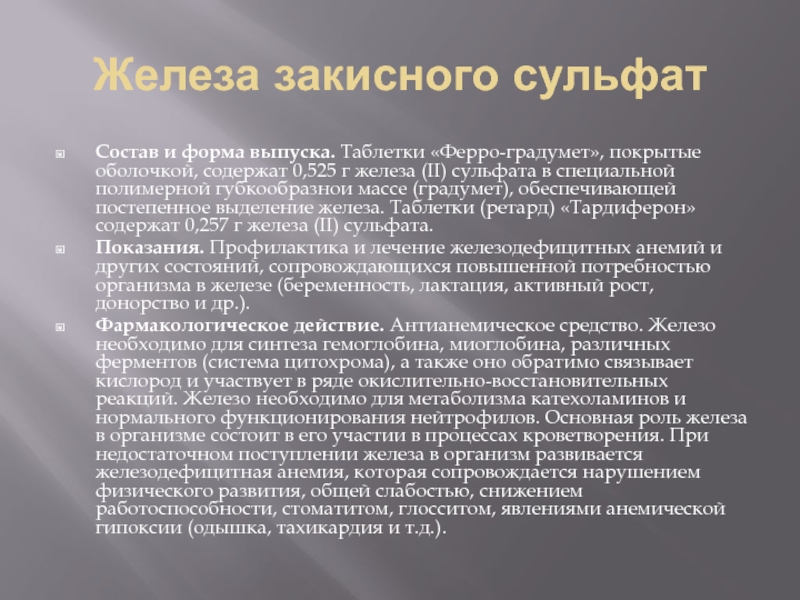 Фармакологическое действие. Антианемическое средство. Железо необходимо для синтеза гемоглобина, миоглобина, различных ферментов (система цитохрома), а также оно обратимо связывает кислород и участвует в ряде окислительно-восстановительных реакций. Железо необходимо для метаболизма катехоламинов и нормального функционирования нейтрофилов. Основная роль железа в организме состоит в его участии в процессах кроветворения. При недостаточном поступлении железа в организм развивается железодефицитная анемия, которая сопровождается нарушением физического развития, общей слабостью, снижением работоспособности, стоматитом, глосситом, явлениями анемической гипоксии (одышка, тахикардия и т.д.).