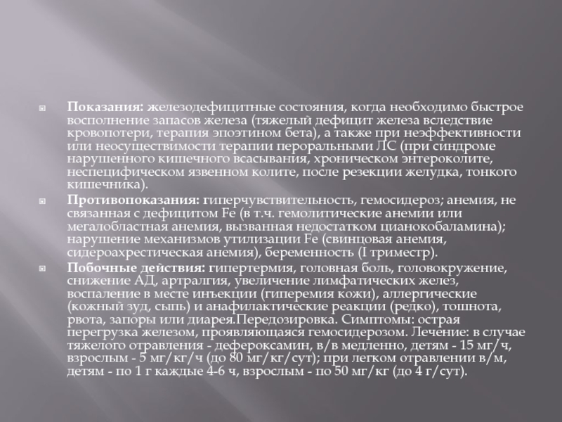Показания: железодефицитные состояния, когда необходимо быстрое восполнение запасов железа (тяжелый