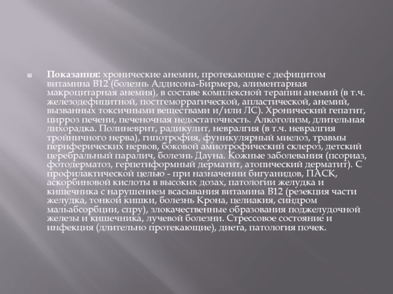 железодефицитной, постгеморрагической, апластической, анемий, вызванных токсичными веществами и/или ЛС). Хронический гепатит, цирроз печени, печеночная недостаточность. Алкоголизм, длительная лихорадка. Полиневрит, радикулит, невралгия (в т.ч. невралгия тройничного нерва), гипотрофия, фуникулярный миелоз, травмы периферических нервов, боковой амиотрофический склероз, детский церебральный паралич, болезнь Дауна. Кожные заболевания (псориаз, фотодерматоз, герпетиформный дерматит, атопический дерматит). С профилактической целью - при назначении бигуанидов, ПАСК, аскорбиновой кислоты в высоких дозах, патологии желудка и кишечника с нарушением всасывания витамина B12 (резекция части желудка, тонкой кишки, болезнь Крона, целиакия, синдром мальабсорбции, спру), злокачественные образования поджелудочной железы и кишечника, лучевой болезни. Стрессовое состояние и инфекция (длительно протекающие), диета, патология почек.