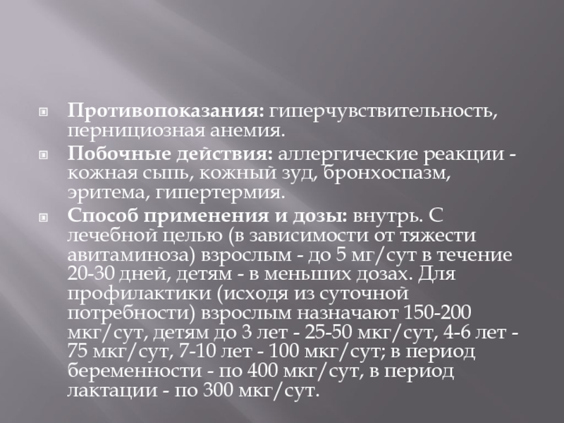 лечебной целью (в зависимости от тяжести авитаминоза) взрослым - до 5 мг/сут в течение 20-30 дней, детям - в меньших дозах. Для профилактики (исходя из суточной потребности) взрослым назначают 150-200 мкг/сут, детям до 3 лет - 25-50 мкг/сут, 4-6 лет - 75 мкг/сут, 7-10 лет - 100 мкг/сут; в период беременности - по 400 мкг/сут, в период лактации - по 300 мкг/сут.