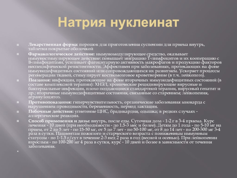 Поазания: инфекции, протекающие на фоне вторичных иммунодефицитных состояний (в составе комплексной терапии): ХНЗЛ, хронические рецидивирующие вирусные и бактериальные инфекции, плохо поддающиеся стандартной терапии, вирусный гепатит и др.; вторичные иммунодефицитные состояния, связанные со старением; лейкопения, агранулоцитоз.