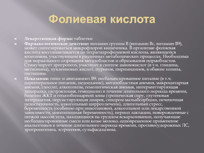 Показания: гипо- и авитаминоз В9: несбалансированное питание (в т.ч. парентеральное питание, недоедание), мегалобластная анемия, макроцитарная анемия, глоссит, алкоголизм, гемолитическая анемия, интермиттирующая лихорадка, гастрэктомия, гемодиализ в течение длительного периода времени, болезни ЖКТ и гепатобилиарной зоны (тропическая спру, глутеновая энтеропатия, персистирующая диарея, синдром мальабсорбции, печеночная недостаточность, алкогольный цирроз печени), длительный стресс, беременность (особенно при никотиновой, алкогольной или лекарственной зависимости, многоплодная беременность), период лактации, новорожденные с низкой массой тела, находящиеся на грудном вскармливании, получающие несбалансированные смеси или козье молоко, одновременное применение анальгетиков в течение длительного периода времени, противосудорожных ЛС, эритропоэтина, эстрогенов, сульфасалазина.