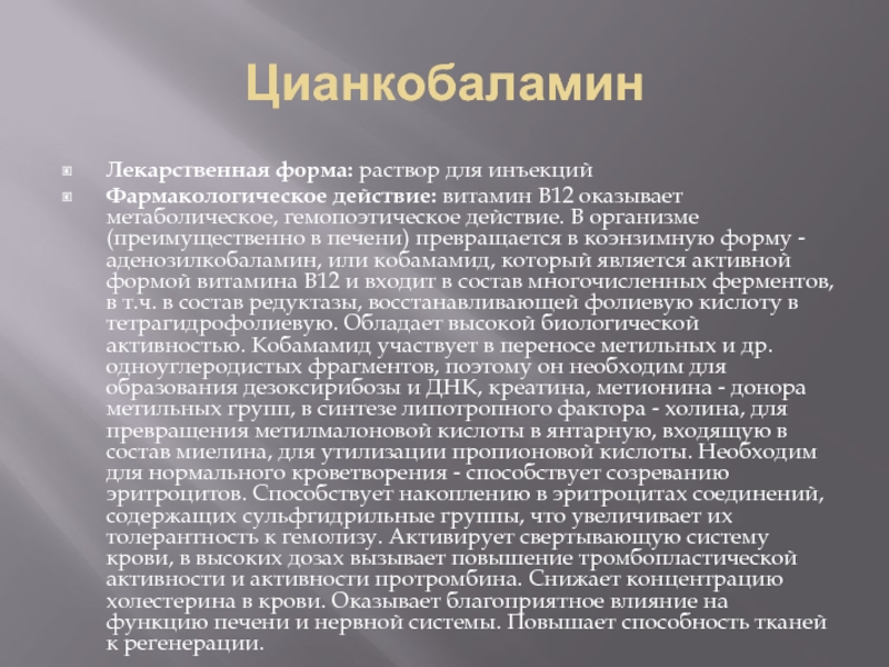 коэнзимную форму - аденозилкобаламин, или кобамамид, который является активной формой витамина B12 и входит в состав многочисленных ферментов, в т.ч. в состав редуктазы, восстанавливающей фолиевую кислоту в тетрагидрофолиевую. Обладает высокой биологической активностью. Кобамамид участвует в переносе метильных и др. одноуглеродистых фрагментов, поэтому он необходим для образования дезоксирибозы и ДНК, креатина, метионина - донора метильных групп, в синтезе липотропного фактора - холина, для превращения метилмалоновой кислоты в янтарную, входящую в состав миелина, для утилизации пропионовой кислоты. Необходим для нормального кроветворения - способствует созреванию эритроцитов. Способствует накоплению в эритроцитах соединений, содержащих сульфгидрильные группы, что увеличивает их толерантность к гемолизу. Активирует свертывающую систему крови, в высоких дозах вызывает повышение тромбопластической активности и активности протромбина. Снижает концентрацию холестерина в крови. Оказывает благоприятное влияние на функцию печени и нервной системы. Повышает способность тканей к регенерации.