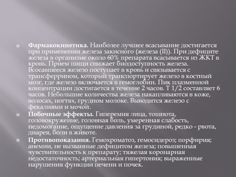 Фармакокинетика. Наиболее лучшее всасывание достигается при применении железа закисного (железа