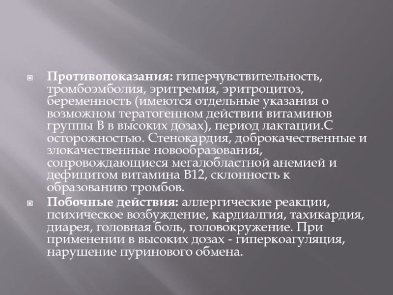 лактации.C осторожностью. Стенокардия, доброкачественные и злокачественные новообразования, сопровождающиеся мегалобластной анемией и дефицитом витамина B12, склонность к образованию тромбов.