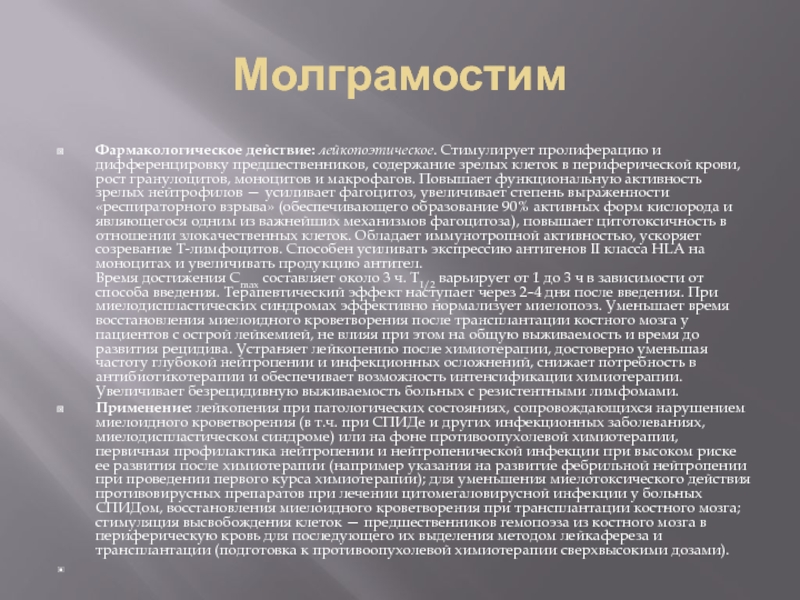Применение: лейкопения при патологических состояниях, сопровождающихся нарушением миелоидного кроветворения (в т.ч. при СПИДе и других инфекционных заболеваниях, миелодиспластическом синдроме) или на фоне противоопухолевой химиотерапии, первичная профилактика нейтропении и нейтропенической инфекции при высоком риске ее развития после химиотерапии (например указания на развитие фебрильной нейтропении при проведении первого курса химиотерапии); для уменьшения миелотоксического действия противовирусных препаратов при лечении цитомегаловирусной инфекции у больных СПИДом, восстановления миелоидного кроветворения при трансплантации костного мозга; стимуляция высвобождения клеток — предшественников гемопоэза из костного мозга в периферическую кровь для последующего их выделения методом лейкафереза и трансплантации (подготовка к противоопухолевой химиотерапии сверхвысокими дозами).