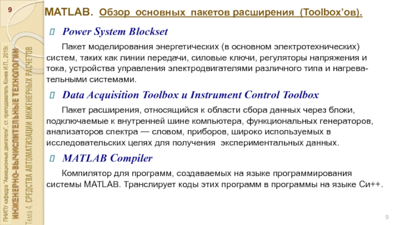 Слайд 9MATLAB. Обзор основных пакетов расширения (Toolbox’ов).