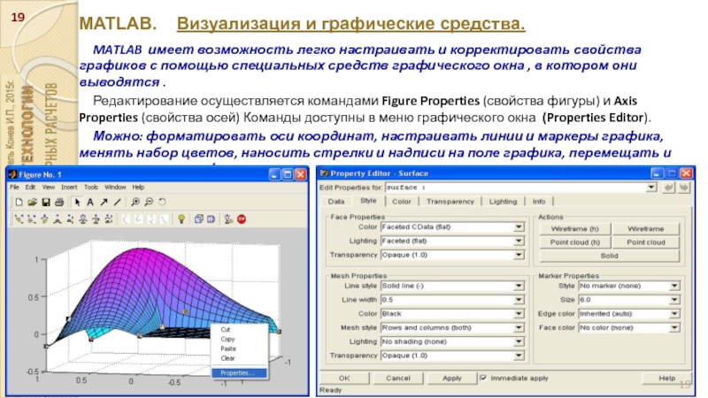Редактирование осуществляется командами Figure Properties (свойства фигуры) и Axis Properties (свойства осей) Команды доступны в меню графического окна (Properties Editor).