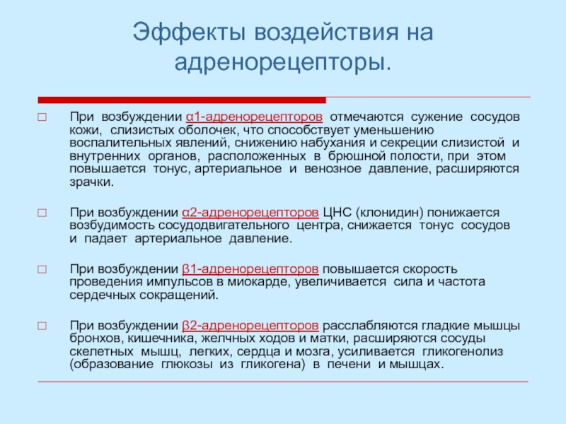 Эффекты воздействия на адренорецепторы.При возбуждении 1-адренорецепторов отмечаются сужение сосудов кожи, слизистых оболочек, что способствует уменьшению воспалительных явлений,