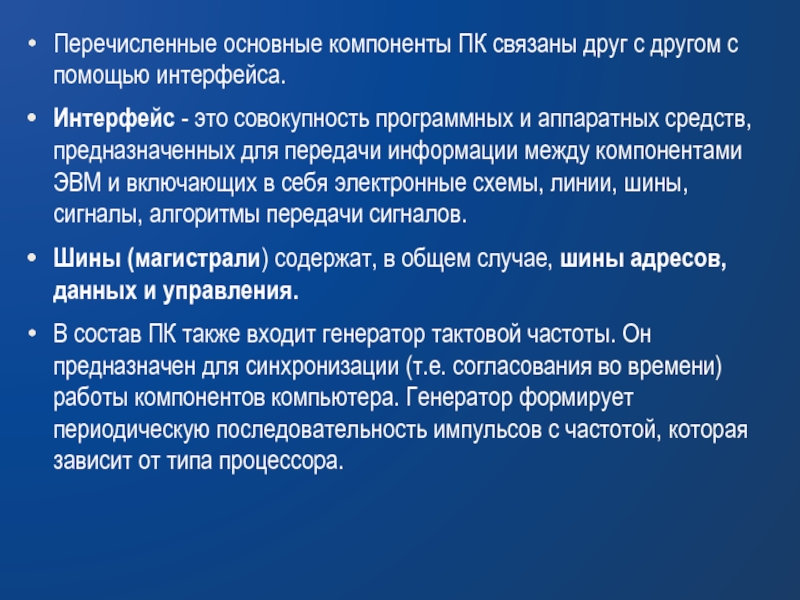В состав ПК также входит генератор тактовой частоты. Он предназначен для синхронизации (т.е. согласования во времени) работы компонентов компьютера. Генератор формирует периодическую последовательность импульсов с частотой, которая зависит от типа процессора.