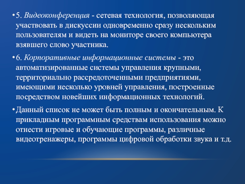Данный список не может быть полным и окончательным. К прикладным программным средствам использования можно отнести игровые и обучающие программы, различные видеотренажеры, программы цифровой обработки звука и т.д.