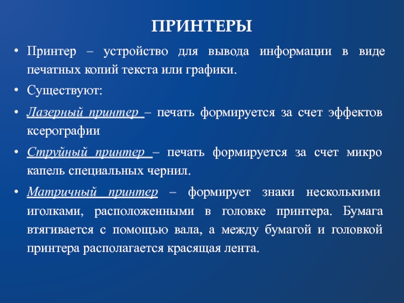 устройства вывода: текстовые и графические мониторы, принтеры, плоттеры, звуковые системы и т.п.;