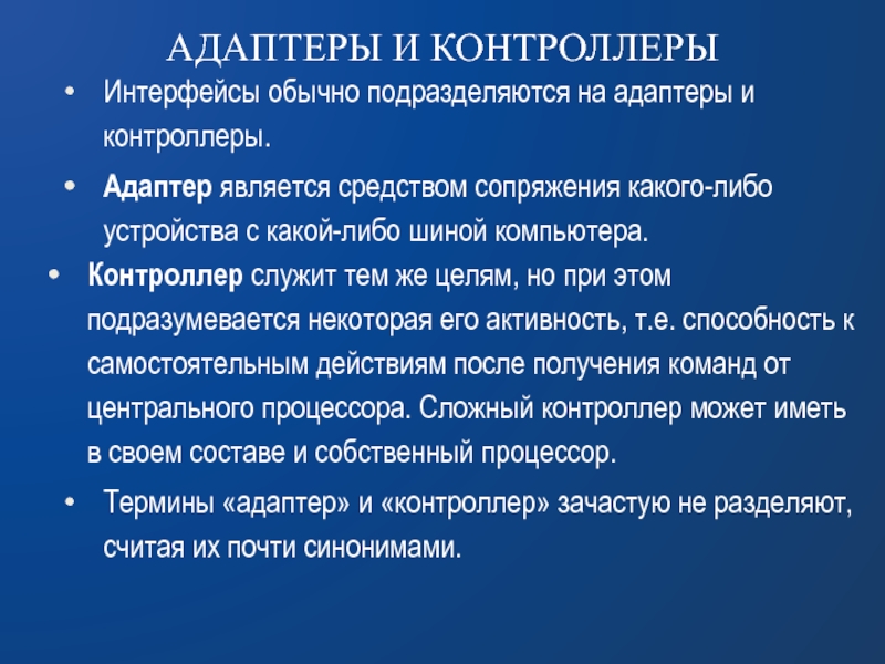 Интерфейсы обычно подразделяются на адаптеры и контроллеры.