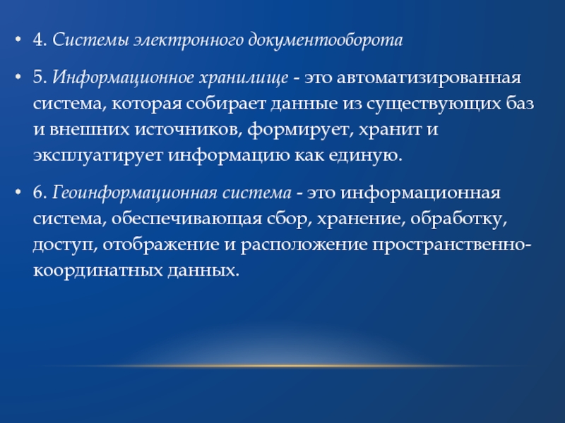 6. Геоинформационная система - это информационная система, обеспечивающая сбор, хранение, обработку, доступ, отображение и расположение пространственно-координатных данных.