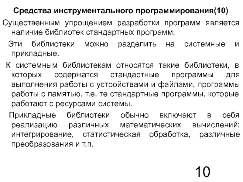 К системным библиотекам относятся такие библиотеки, в которых содержатся стандартные программы для выполнения работы с устройствами и файлами, программы работы с памятью, т.е. те стандартные программы, которые работают с ресурсами системы.