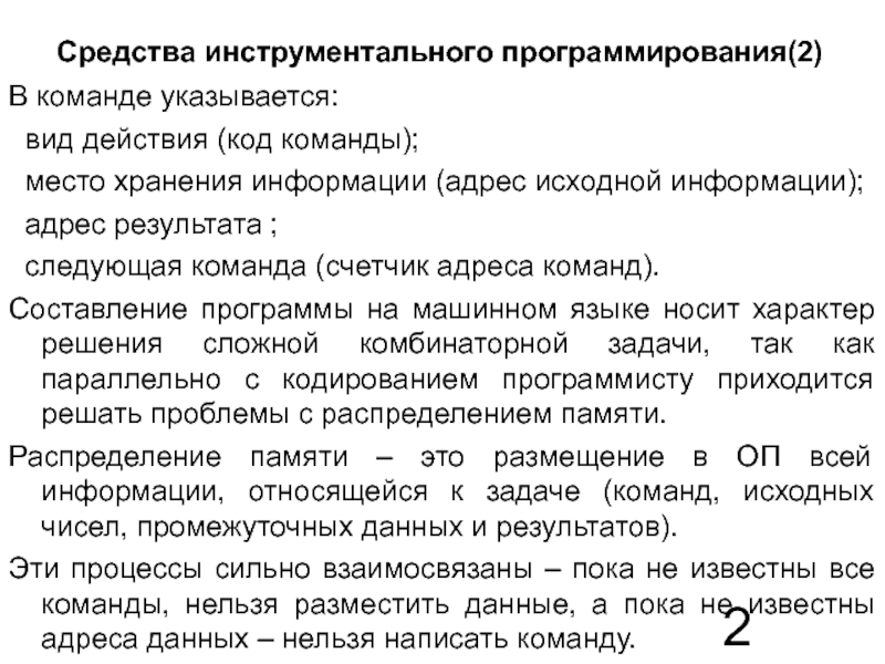 Составление программы на машинном языке носит характер решения сложной комбинаторной задачи, так как параллельно с кодированием программисту приходится решать проблемы с распределением памяти.