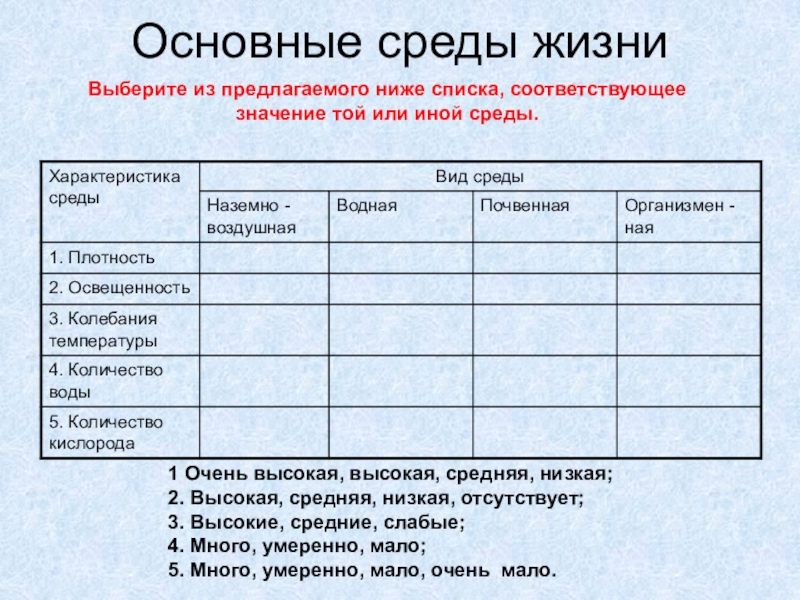 Выберите из предлагаемого ниже списка, соответствующее значение той или иной среды.